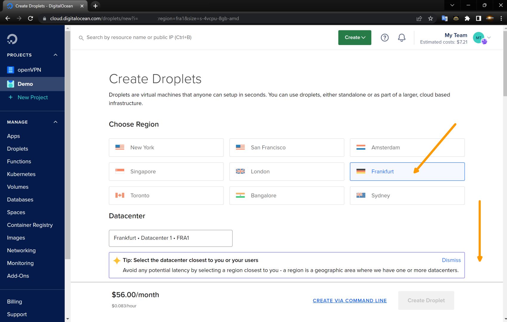 The setup and installation is best described with a few pictures that I hope are self-explanatory. At the first moment the interface is a bit hard to get used to. First you have to create a new project and then click on Spin up Droplet at Welcome to DigitalOcean! to set up a Droplet, a Virtual Private Server (VPS). Everything else is shown in the pictures. Choose the region closest to you, Ubuntu as operating system, Shared CPU Basic, the regular CPU and for the authentication method you have the choice. If you are familiar with SSH keys, choose this. It is the safest, but not necessarily the easiest method. If you are not sure, it is better to choose a very strong password. Activate the free monitoring, because it gives you a good overview about the state and the used resources of the VPS. Then assign a hostname of your choice and select Create Droplet. That was it. Now you have your own Virtual Private Server.